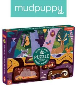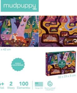 Puzzle dwustronne Las nad i pod ziemią amerykańskiej marki MUDPUPPY nadają układaniu puzzli nowy wymiar – na samym złożeniu sporego obrazka (o wymiarach 55 x 42 cm) zabawa się bowiem nie kończy. Po obróceniu go okazuje się bowiem, że na drugiej stronie powstała kolejna, zupełnie nowa ilustracja! Następnym razem dziecko może zacząć układanie właśnie od niej. Jedna strona puzzli przedstawia gatunki leśnych zwierząt, żyjących na ziemi i na drzewach, druga – te ryjące i zamieszkujące pod ziemią. Niebanalny design i piękne kolory dodatkowo zachęcają do zabawy. Taka układanka to również świetny sposób na pierwsze lekcje przyrody i poznanie ciekawych stworzeń. Autorem ilustracji jest Alexander Vidal – artysta, antropolog i podróżnik z Nowego Meksyku. Puzzle zapakowane są w estetyczne kartonowe pudełko. Idealnie nadają się na prezent.