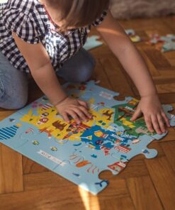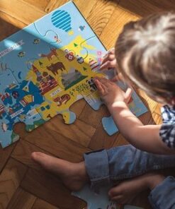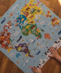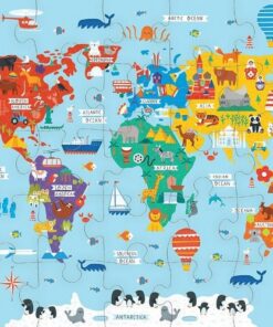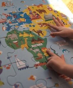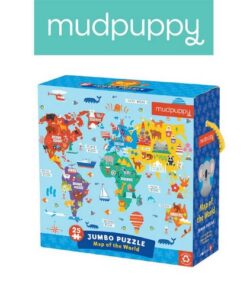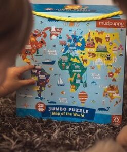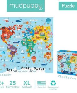 Zestaw puzzli podłogowych Jumbo Mapa świata amerykańskiej marki MUDPUPPY składa się z 25 bardzo dużych, łatwych do układania elementów. Ułożony z nich sporych rozmiarów (56 x 56 cm) obrazek przedstawia urokliwą mapę świata z kolorowymi kontynentami, jasnoniebieskimi morzami i oceanami, oraz charakterystycznymi dla poszczególnych lądów i wód gatunkami zwierząt, elementami przyrody, budowlami i pojazdami. Wyjątkowy design i przyjazne barwy dodatkowo zachęcają dziecko do zabawy. Puzzle zapakowane są w estetyczne pudełko z wygodną do przenoszenia rączką ze sznurka. Idealnie nadają się na prezent.