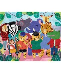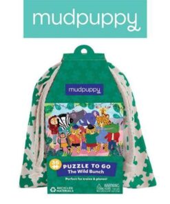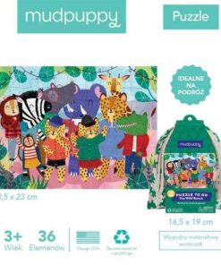 Zestaw puzzli podróżnych Dzika ekipa amerykańskiej marki MUDPUPPY składa się z 36 poręcznych dla dziecka elementów. Zapakowane są one w wygodny do transportu, ściągany solidnym sznurkiem jasny woreczek z turkusowym wzorem puzzli. Ułożony obrazek przedstawia grupę zaprzyjaźnionych ze sobą zwierząt z dżungli, m.in. gepardy, krokodyla, zebrę czy żyrafę, które wybrały się na wycieczkę. Rozmiarami – 30,5 x 23 cm – dostosowany jest do wymiarów stolika w samolocie, pociągu lub samochodzie. Ładny design i przyjazne barwy dodatkowo zachęcają malca do zabawy. Puzzle idealnie nadają się na prezent.