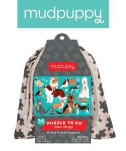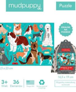 Zestaw puzzli podróżnych Pieski amerykańskiej marki MUDPUPPY składa się z 36 poręcznych dla dziecka elementów. Zapakowane są one w wygodny do transportu, ściągany solidnym sznurkiem jasny woreczek z szarym wzorem puzzli. Ułożony obrazek przedstawia różne rasy uroczych psów. Rozmiarami – 30,5 x 23 cm – dostosowany jest do wymiarów stolika w samolocie, pociągu lub samochodzie. Ładny design i przyjazne barwy dodatkowo zachęcają malca do zabawy. Puzzle idealnie nadają się na prezent.