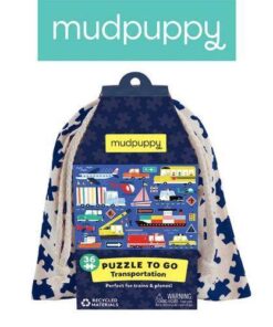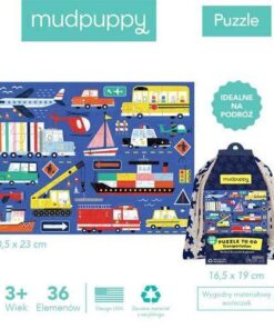 Zestaw puzzli podróżnych Transport amerykańskiej marki MUDPUPPY składa się z 36 poręcznych dla dziecka elementów. Zapakowane są one w wygodny do transportu, ściągany solidnym sznurkiem jasny woreczek z szarym wzorem puzzli. Ułożony obrazek przedstawia różne pojazdy, statki i samoloty, a także znaki i inne elementy infrastruktury drogowej. Rozmiarami – 30,5 x 23 cm – dostosowany jest do wymiarów stolika w samolocie, pociągu lub samochodzie. Ładny design i przyjazne barwy dodatkowo zachęcają malca do zabawy. Puzzle idealnie nadają się na prezent.