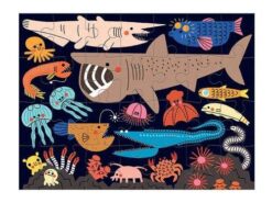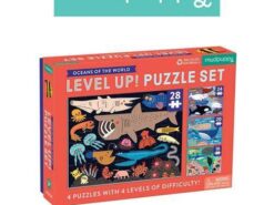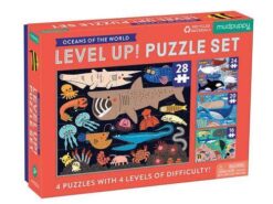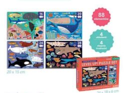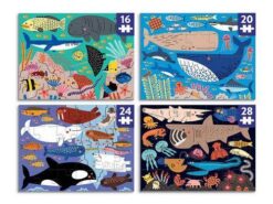 Puzzle progresywne Oceny świata amerykańskiej marki MUDPUPPY to zestaw 4 układanek o różnym stopniu trudności dla dzieci od 3. roku życia. Puzzle liczą sobie kolejno więcej elementów – 16, 20, 24 i 28, dzięki czemu dzieci stopniowo uczą się radzić sobie z coraz trudniejszymi układankami. Obrazki o rozmiarze 15 x 20 cm każdy, przedstawiają morskie stworzenia, w tym duże i małe ryby oraz podwodną roślinność na tle różnych odcieni wody – od jasno-błękitnej toni po niemal czarne głębiny. Gotowe ilustracje można potraktować jako pretekst do snucia barwnych opowieści o życiu w oceanie. Piękne kolory i sympatyczne (lub niekoniecznie) zwierzęta dodatkowo zachęcają do zabawy.