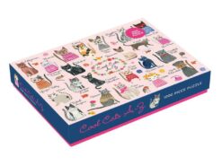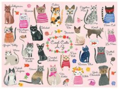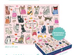 Puzzle rodzinne 1000 elementów amerykańskiej marki MUDPUPPY po ułożeniu tworzą duży obraz o wymiarach 68,5 x 51 cm. Przedstawiają 23 różne rasy kotów, w kolejności alfabetycznej wraz z nazwą rasy (wg nazwy w języku angielskim) i ulubione kocie zabawki, na jasnoróżowym tle. Układanie tych wyjątkowych puzzli to doskonała rozrywka dla całej rodziny i świetne źródło wiedzy o kotach. Puzzle zapakowane są w estetyczne pudełko. Idealnie nadają się na prezent.