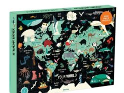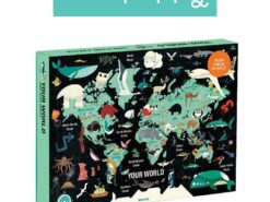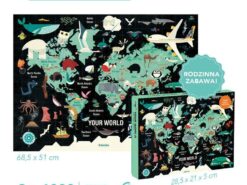 Puzzle rodzinne 1000 elementów Twój świat amerykańskiej marki MUDPUPPY po ułożeniu tworzą duży obraz o wymiarach 68,5 x 51 cm. Przedstawiają turkusową mapę świata na czarnym tle, z oznaczonymi nazwami kontynentów (po angielsku) i ilustracjami zwierząt, występujących w danym rejonie. Układanie tych wyjątkowych puzzli to doskonała rozrywka dla całej rodziny i świetne źródło wiedzy o świecie. Autorem projektu jest angielski rysownik i animator Paul Daviz. Puzzle zapakowane są w estetyczne pudełko. Idealnie nadają się na prezent.