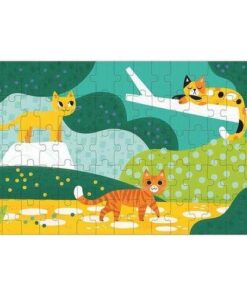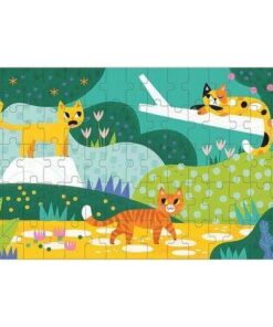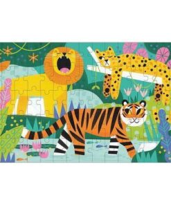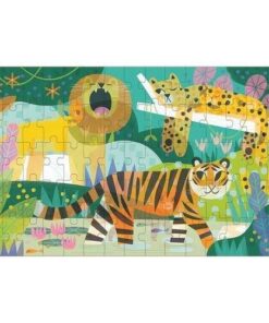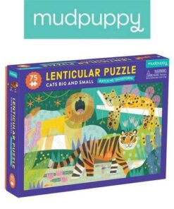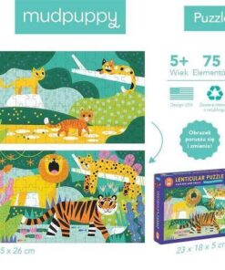 Puzzle soczewkowe Duże i małe koty amerykańskiej marki MUDPUPPY nadają układaniu puzzli nowy wymiar – na samym złożeniu obrazka zabawa się bowiem nie kończy. Układanka składa się z 75 elementów, które po ułożeniu tworzą obrazek o wymiarach 45 x 26 cm, przedstawiający dzikie koty – lwa, tygrysa i geparda. Dzięki specjalnej technice druku, zwanej drukiem soczewkowym, ilustracja porusza się i „ożywa” w zależności od tego, pod jakim kątem się na nią patrzy – zmienia się nie tylko tło (posiadające efekt głębi 3D), ale też bohaterowie, którzy z małych kotków wyrastają na dorosłych przedstawicieli swoich gatunków.