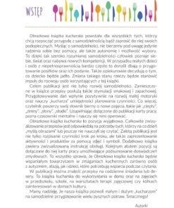 Kolejnym atutem pozycji są dołączone do niej karty pracy umożliwiające podsumowanie doświadczeń zmysłowych. To wszystko sprawia, że Obrazkowa książka kucharska będzie wspaniałym towarzyszem w zmaganiach kuchennych zarówno osób z autyzmem, afazją, jak i dzieci, które potrzebują wsparcia podczas czytania.
