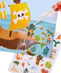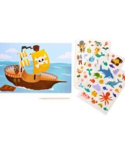 Ahoj! Czas ustawić żagle w stronę fascynującej zabawy na pełnym morzu! Pobudź swoją wyobraźnię i przenieś się w świat piratów! Zestaw zawiera dwustronną planszę z morskim krajobrazem, 60 naklejek i patyczek, który służy do odbijania wzorów. Stwórz oceaniczną historyjkę za pomocą własnoręcznie wyklejonego obrazka!