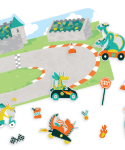 Dwustronna składana plansza zapewnia dwie scenografie do historyjek wymyślanych przez dziecko. Aktorami i rekwizytami są w nich sprytne naklejki, które można łatwo odklejać i przyklejać. Nieużywane naklejki spokojnie czekają na specjalnej podkładce. Wszystko można złożyć i schować, gdy nie jest potrzebne a także zabrać ze sobą w podróż, do restauracji, na obiad do babci i wszędzie tam, gdzie dziecku może być potrzebna rozrywka.