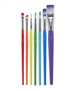 - zestaw zawiera: 7 kolorowych pędzli różnej wielkości i o różnym kształcie końcówek (m. in. mała płaska, bardzo mała okrągła, średnia ścięta, wachlarzowa, duża płaska) do różnych rodzajów pociągnięć