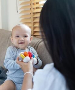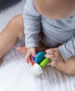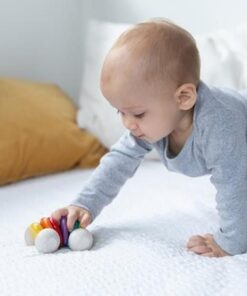 To pierwsza zabawka manipulacyjna dla malucha, angażuje spostrzeżenia wzrokowe, słuchowe, dotykowe oraz złożone ruchy rąk. Wspiera małą i dużą motorykę, koordynację ręka – oko.