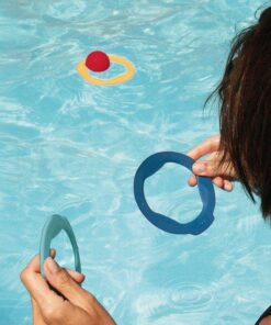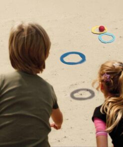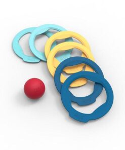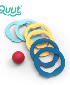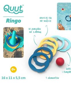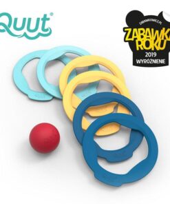 Gra Ringo belgijskiej marki Quut przyciąga wzrok niebanalnym designem i oryginalną kolorystyką. Składa się z 6 lekkich i łatwych do utrzymania przez dziecko kółek z tworzywa – po 2 w kolorach jasnoniebieskim, ciemnoniebieskim i żółtym, oraz sprężystej wiśniowej piłeczki. Kółka mają aerodynamiczną konstrukcję, ich kolorystyka gwarantuje maksymalną widoczność na każdej powierzchni, a miękkie krawędzie zapewniają bezpieczeństwo młodym graczom. Co więcej, unoszą się one na wodzie, co znacząco powiększa obszar pomysłów do zabawy i zastosowań zestawu. Gra Ringo doskonale łączy się z innymi zabawkami marki Quut, np. łopatkami wielofunkcyjnymi Triplet i Cuppi. Gwarantuje inteligentną aktywność w domu i na świeżym powietrzu, i to przez cały rok. Sprawdzą się bowiem nie tylko do zabaw w piasku (na plaży czy w piaskownicy), ale także w wodzie (w wannie), śniegu czy ogrodzie.