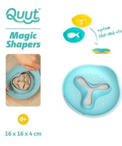 Foremki wielofunkcyjne Magic Shapers przyciągają wzrok niebanalnym designem i oryginalną kolorystyką. Lekkie, wygodne do trzymania przez dziecko, w kształcie okrągłych dysków z otworami o różnych kształtach pośrodku – do wyboru jest jeden z 4 wzorów: granatowa foremka ma otwór w kształcie rybki, turkusowa – rozgwiazdy i dodatkowo posiada dziurki, dzięki którym może pełnić funkcję sitka, żółta – otwór w kształcie słońca, a jasnoróżowa – w kształcie serca.