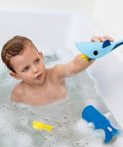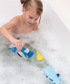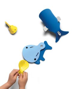 Komplet składa się z 5 części, wykonanych z wyjątkowego materiału, jakim jest pianka EVA, w intensywnych kolorach (chabrowy, niebieski, jasny szary i żółty). Dzięki rozcięciom, otworom i guziczkom można z nich stworzyć 3 przestrzenne figurki – 2 wieloryby (większego i mniejszego) i niedużą rybkę, idealne do zabawy w wannie.