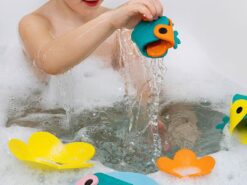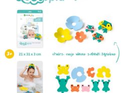 Komplet składa się z 9 części, wykonanych z wyjątkowego materiału, jakim jest pianka EVA, w intensywnych kolorach (turkus, żółty, pomarańczowy, niebieski i różowy). Dzięki rozcięciom, otworom i guziczkom można z nich stworzyć 6 przestrzennych figurek – rodzinę 3 żabek (1 większa i 2 mniejsze) i 3 lilie wodne, idealnych do zabawy w wannie.