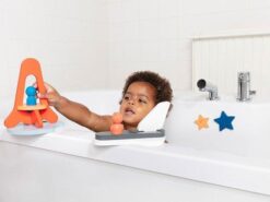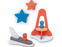 Zestaw puzzli piankowych 3D Wyprawa na księżyc z kolekcji Quutopia belgijskiej marki Quut to innowacyjna zabawka do kąpieli, która zadziwia pomysłowością, rozwija kreatywność, przyciąga wzrok niebanalnym designem i oryginalną kolorystyką. Komplet składa się z 13 części, wykonanych z wyjątkowego materiału – pianki EVA – w pięknych kolorach (białym, ciemnoszarym, odcieniach pomarańczu i odcieniach niebieskiego). Dzięki nacięciom i otworom można z nich stworzyć przestrzenny prom kosmiczny oraz rakietę z platformą. Dodatkowo w zestawie znajdują się 2 gwiazdy, które po zwilżeniu wodą można „przykleić” do wanny, kabiny prysznicowej czy płytek w łazience, oraz 2 figurki astronautów, mogące także pełnić rolę pacynek do odgrywania scen podniebnych przygód. Puzzle są idealne do zabawy w wannie. Elementy unoszą się na wodzie, są lekkie i szybkoschnące.