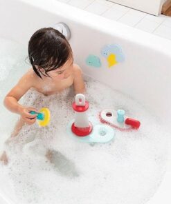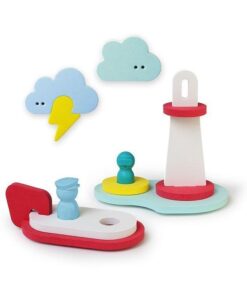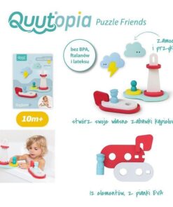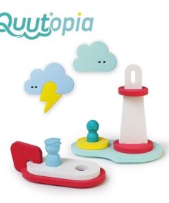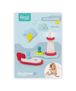 Zestaw puzzli piankowych 3D Na ratunek z kolekcji Quutopia belgijskiej marki Quut to innowacyjna zabawka do kąpieli, która zadziwia pomysłowością, rozwija kreatywność, przyciąga wzrok niebanalnym designem i oryginalną kolorystyką. Komplet składa się z 12 części, wykonanych z wyjątkowego materiału – pianki EVA – w pięknych kolorach (m. in. żółtym, czerwonym, niebieskim i turkusowym zielonym). Dzięki nacięciom i otworom można z nich stworzyć przestrzenną wyspę z latarnią morską oraz motorówkę ratunkową. Dodatkowo w zestawie znajdują się 2 chmurki i piorun, które po zwilżeniu wodą można „przykleić” do wanny, kabiny prysznicowej czy płytek w łazience, oraz 2 figurki – latarnika i kapitana, mogące także pełnić rolę pacynek do odgrywania scen wodnych przygód. Puzzle są idealne do zabawy w wannie. Elementy unoszą się na wodzie, są lekkie i szybkoschnące.