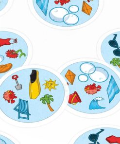 Dobble Plaża to 30 kart, na których znajdziecie po 6 symboli związanych z morzem i plażą. Na 2 dowolnych kartach zawsze znajduje się dokładnie 1 wspólny symbol. Niezależnie od tego, czy grasz nad jeziorem, na basenie czy w wannie, Twoim celem jest jak najszybciej odnaleźć wspólny symbol i wygrać!