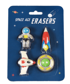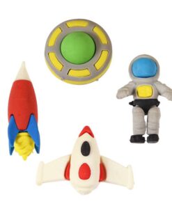 Cztery kosmiczne gumki do ścierania dla miłośników podróży międzygalaktycznych. Przydadzą się w szkole i w domu. Podczas nauki pisania a także przy rozwiązywaniu zadań i rysowaniu. Pomogą skorygować błędy a przy tym są niebanalną ozdobą biurka i podręcznym zestawem do zabawy, który przyda się na przerwach.