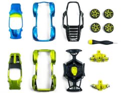 Zestaw Modarri Delux S2 Muscle zawiera 13 wymiennych części miedzy innymi: ziolna maska, błotniki i rama samochodu ulicznego Muscle, niebieska maska i błotniki kabrioletu, siedzenie, 4 koła, 2 zawieszenia. Opakowanie zawiera śrubokręt.