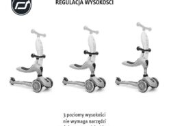 Bez używania narzędzi, za pomocą jednego guzika można w kilka sekund zamienić pojazd w hulajnogę na 3 kołach – obrócone siedzisko staje się jej przednią ramą. Wystarczy jeszcze przenieść kierownicę (montowana na klik) i gotowe! Teraz także starszak może rozpocząć swoją scaterską przygodę.