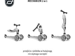 Bez używania narzędzi, za pomocą jednego guzika można w kilka sekund zamienić pojazd w hulajnogę na 3 kołach – obrócone siedzisko staje się jej przednią ramą. Wystarczy jeszcze przenieść kierownicę (montowana na klik) i gotowe! Teraz także starszak może rozpocząć swoją scaterską przygodę.