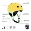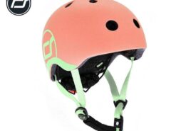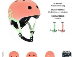 - kask jest spójny kolorystycznie z kolekcją Highwaykick 1 Icecream – po bokach brzoskwiniowej skorupy (w kolorze Peach), znajdują się jasnozielone (w kolorze Kiwi) grafiki z logo Scoot&Ride, w tym samym kolorze są również taśmy regulujące