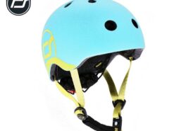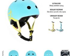 - kask jest spójny kolorystycznie z kolekcją Highwaykick 1 Icecream – po bokach elektryzująco jasnoniebieskiej skorupy (w kolorze Blueberry), znajdują się jasnożółte (w kolorze Lemon) grafiki z logo Scoot&Ride, w tym samym kolorze są również taśmy regulujące