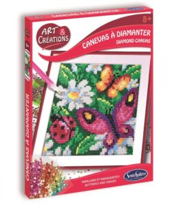 Zestaw artystyczny Obraz z diamentami Motyle francuskiej marki SentoSphère to barwny obraz motyli i kwiatów, ozdobiony samodzielnie przez dziecko. Mały patyczek – rysik pomoże w złapaniu i przeniesieniu diamentów na samoprzylepne płótno. Każdy punkt jest zaznaczony literą odpowiadającą kolorowi diamenciku. Ilustracja jest bardzo łatwa do kolorowania.