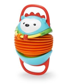 Na JEŻYKU AKORDEONIE gra się jak na prawdziwym instrumencie – aby wydobyć dźwięk należy płynnie rozwijać i składać harmonijkę, trzymając za wygodne dla małych rączek uchwyty. Gra na harmonii będzie wyzwaniem i wspaniałą zabawą dla maluszków, które zachęcone oklaskami publiczności, zaszczepią w sobie zamiłowanie do muzycznych eksperymentów. Zabawa z JEŻYKIEM AKORDEONEM nie kończy się na graniu. W przerwach pomiędzy koncertami dzieci mogą trenować paluszki rolując barwne koraliki, odkrywać detale o różnorodnej teksturze i bezpiecznie podgryzać gumowe elementy dając ukojenie dziąsełkom w czasie ząbkowania.