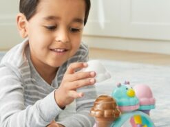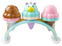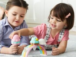 Jedna gałka czy dwie? A może sześć? Maluchy będą tworzyć mnóstwo przysmaków z super słodkim zestawem do robienia lodów! Układane w stosy gałki z magicznymi, zmieniającymi kolor polewami – posypkami to frajda dla dzieci, które odkrywają je po zanurzeniu w zimnej wodzie. Trzy rożki oraz jednorożcowa gałka i tęczowa podstawka do serwowania tworzą 10-częściowy zestaw do zabawy w lodziarnię.