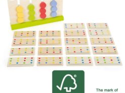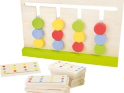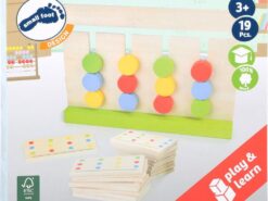 Zestaw zawiera tablicę do sortowania oraz deseczki na których nadrukowane są kolorowe kropki. Zadanie malucha polega na tym, że musi ułożyć identyczny wzór jak ten z tabliczki, przesuwając kolorowe krążki. Ta zabawa to nie lada wyzwanie, troszkę trzeba pokombinować aby ułożyć prawidłową kombinację kolorów.