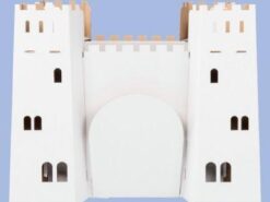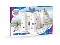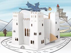 Konstrukcja zamku składa się z białej, trójwarstwowej tektury, którą maluch może samodzielnie ozdobić – wystarczą mu farby, kredki i nieograniczona wyobraźnia, a wszystkie komnaty zyskają magiczny wręcz urok! Potem mały artysta może używać zamku jako tła do wszelakich zabaw.