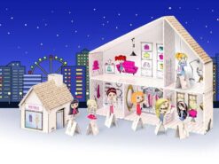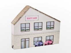 - zestaw zawiera: kartonowy salon piękności z kolorowym nadrukiem z zewnątrz, 7 figurek dziewczynek, butik – mniejszy domek z kartonu, naklejki do oklejenia 5 pomieszczeń