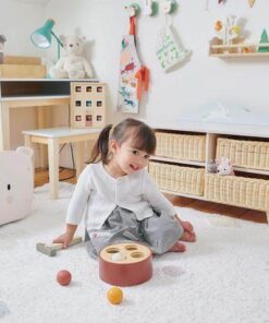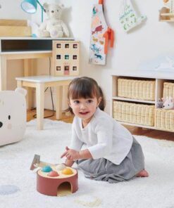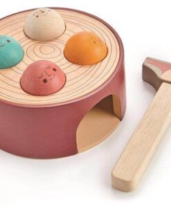 W zestawie drewniana podstawa przedstawiająca pień drzewa, cztery różnokolorowe, uśmiechnięte kulki umieszczone w otworach i młotek z nadrukiem dzięcioła. Za pomocą młoteczka/dzięcioła trzeba wbić kulki w otwory. Kulki wyturlają się przez boczny otwór i dziecko może powtórzyć ćwiczenie!