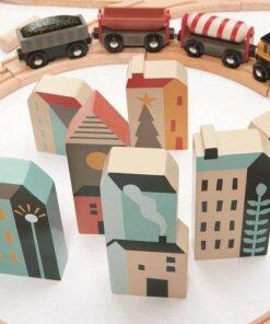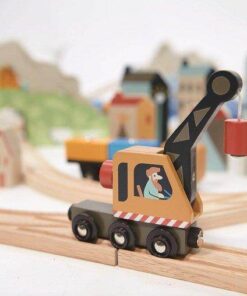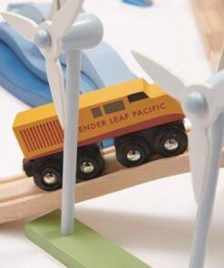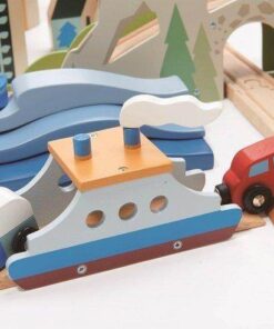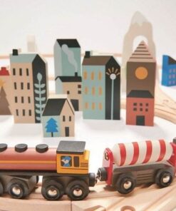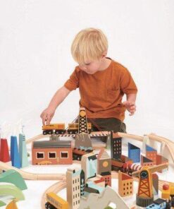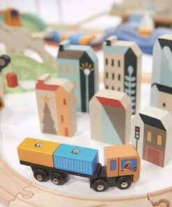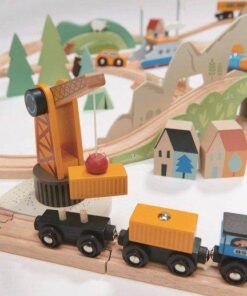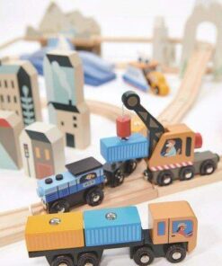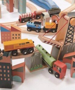 Wspaniała zabawka, która zapewni kreatywną zabawę na długie godziny! W zestawie 58 części do zbudowania torów według własnego pomysłu oraz wiele akcesoriów. Możesz zbudować całe miasteczko, w którym w części przemysłowej znajdzie się specjalny podnoszony most, 7 budynków fabryk, 3 kominy, kontenerowiec wraz z 7 kontenerami na magnesy oraz dźwig do ich przenoszenia, pociąg z dwoma wagonami do transportu kontenerów. W części mieszkalnej można rozmieścić 10 budynków mieszkalnych, prom samochodowy, ciężarówkę z paliwem, ciężarówkę z kontenerami, dźwig oraz samochody osobowe. W strefie wakacyjnej mamy żaglówkę, samochód z przyczepą kempingową, 4 wiatraki, 3 namioty, 3 leśne choinki oraz niedźwiedzia i owieczkę. Przejazd kolejki możesz również urozmaicić poprzez dodanie górskich tuneli, wodospadu czy mostu – dostępnych akcesoriów marki Tender Leaf Toys.