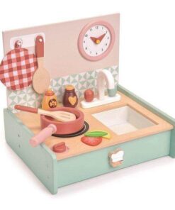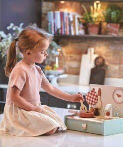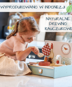 W zestawie poza kuchenką znajdziesz wiele starannie wykonanych akcesoriów kuchennych, takich jak: patelnia, akcesoria do smażenia, owoce do dekoracji. W Tender Leaf Toys przykładamy dużą wagę do szczegółów.