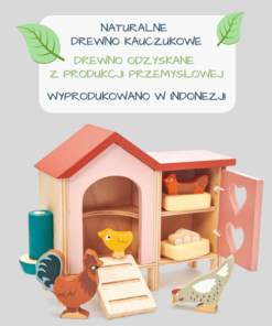 Zestaw składa się z kurnika oraz rodzinki: koguta, 2 kurek i małego kurczaczka! W kurniku są gniazda dla kurek oraz świeżo złożone jajka. Będzie wspaniałym dodatkiem do naszych drewnianych domków!