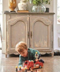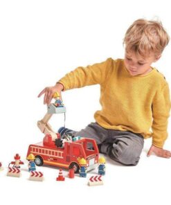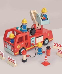 Drewniany wóz strażacki z rozkładanym podnośnikiem, czterema dzielnymi strażakami, czterema barykadami, gaśnicą i hydrantem. Podłącz wóz do hydrantu i gaś pożar za pomocą wysuwanego węża strażackiego. Rozłóż barykady dla zapewnienia bezpieczeństwa. Strażacy do dyspozycji mają również przenośną gaśnicę.