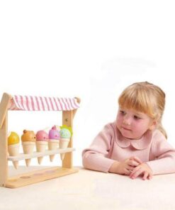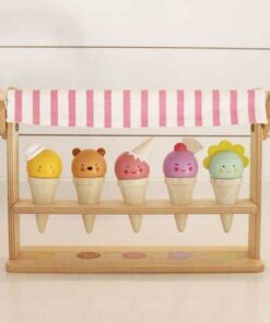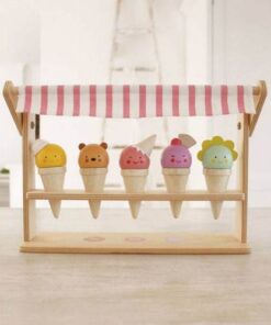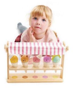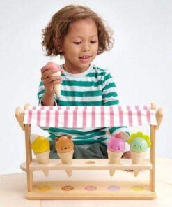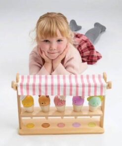 Piękne, smakowite kolory lodów i specjalny stojak z materiałowym daszkiem w paski sprawią, że mini sklepik z lodami będzie ulubioną zabawką Twojego dziecka!