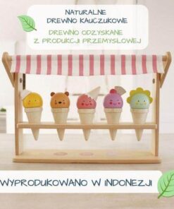 5 kolorowych, drewnianych lodów w rożkach – każdy o innym smaku i wyglądzie! Zaproś do zabawy przyjaciół i częstuj ich pysznymi lodami!
