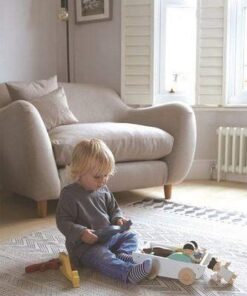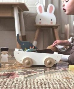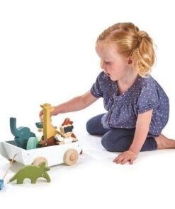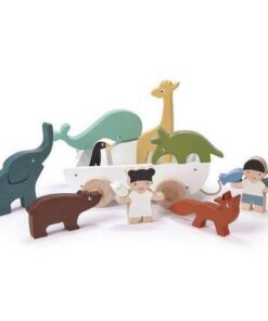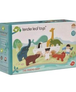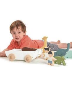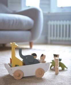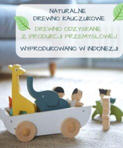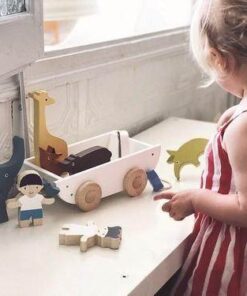 W zestawie drewniany, biały statek na kółkach z linką do ciągnięcia oraz kolorowe figurki – słoń, żyrafa, mrówkojad, wieloryb, lis, pingwin, niedźwiedź oraz chłopiec z myszką i dziewczynka z ptaszkiem. Zaproś wszystkie zwierzątka na statek i zabierz je w interesującą podróż po swoim pokoju!