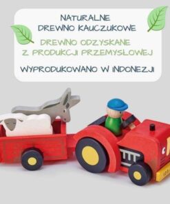 Czerwony traktor z przyczepą, figurką rolnika za kierownicą oraz dwoma wesołymi zwierzątkami – owcą i osiołkiem. Traktor posiada specjalny hak do przyłączenia przyczepki!