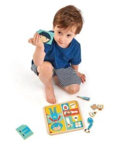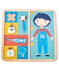 Edukacyjna układanka składająca się z 12 elementów, które należy dopasować w odpowiednie miejsce na planszy. Plansza podzielona jest na dwie części: po jednej stronie jest postać chłopca z zaznaczonymi głównymi narządami i kośćmi, a po drugiej stronie należy dopasować prawidłowe lekarstwa i przyrządy do zilustrowanych dolegliwości, których możemy doznać. Dziecko poznaje budowę ciała człowieka i uczy się nazywać części ciała, opisywać dolegliwości i pomocne lekarstwa.