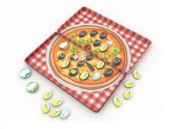 • w zestawie znajdują się 4 magnesy szefa kuchni imitujących pionki, 44 magnesy z oliwkami, 2 magnesy z pieczarkami oraz kostka do gry