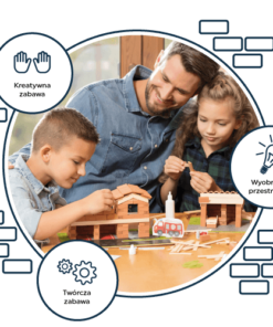 Zostań konstruktorem, wykorzystując do budowy prawdziwe cegły i drewno! W instrukcji znajdziesz obszerne ciekawostki prosto z placu budowy. Dowiedz się, jak urozmaicić swoją konstrukcję dzięki wielu interesującym pomysłom i rozwiązaniom. Buduj według instrukcji lub użyj wyobraźni do stworzenia własnej, niepowtarzalnej konstrukcji. Możesz też połączyć kilka budynków, tworząc klimat wsi, miasta lub średniowiecza. Skorzystaj z dołączonych planów budowy lub użyj wyobraźni do stworzenia niepowtarzalnej konstrukcji. Baw się dołączonymi pionkami prosto z wiejskiego świata! To nie koniec zabawy! Rozpuść konstrukcję w wodzie i buduj dalej wykorzystując ponownie te same cegły! W zestawie znajdziesz: prawdziwe cegły, klej, drewniane deseczki, elementy dekoracyjne, pionki, podstawkę, naklejkę i instrukcję!