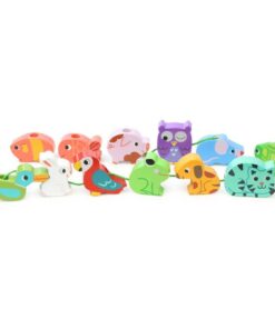 Drewniane klocki Zwierzęta francuskiej marki Vilac, to zestaw różnokształtnych, kolorowych klocków, które można nawlekać lub stworzyć z nich piękny wzór: zwierzątka domowe, leśne lub z farmy. Zestaw zawiera 12 kolorowych klocków ze specjalnym, bezpiecznym sznurkiem.