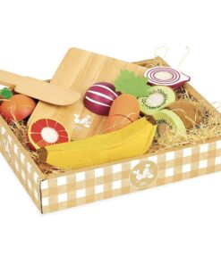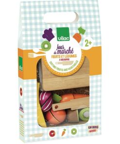Owoce i warzywa do krojenia francuskiej marki Vilac, to zestaw 5 drewnianych owoców i warzyw w kartonowej skrzynce, do zabawy w krojenie i gotowanie. Skrzynka zawiera: 2 połówki złączonych ze sobą na rzepy: cebuli, pomarańczy, kiwi, marchewki oraz banana, drewnianą deskę oraz nożyk do krojenia. Kiwi można nawet obrać ze skórki ! Do tego banan, pomarańcza i pyszna owocowa przekąska gotowa!