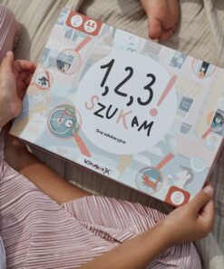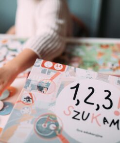 1,2,3! Szukam to gra edukacyjna zawierająca 6 plansz wraz z żetonami. Każda z nich to bogato ilustrowana historia rozgrywająca się w innym otoczeniu: w mieście, na wsi, w przedszkolu, na pikniku, na basenie, na meczu. Zabawa polega na odnalezieniu elementów pokazanych na żetonach w jak najkrótszym czasie.