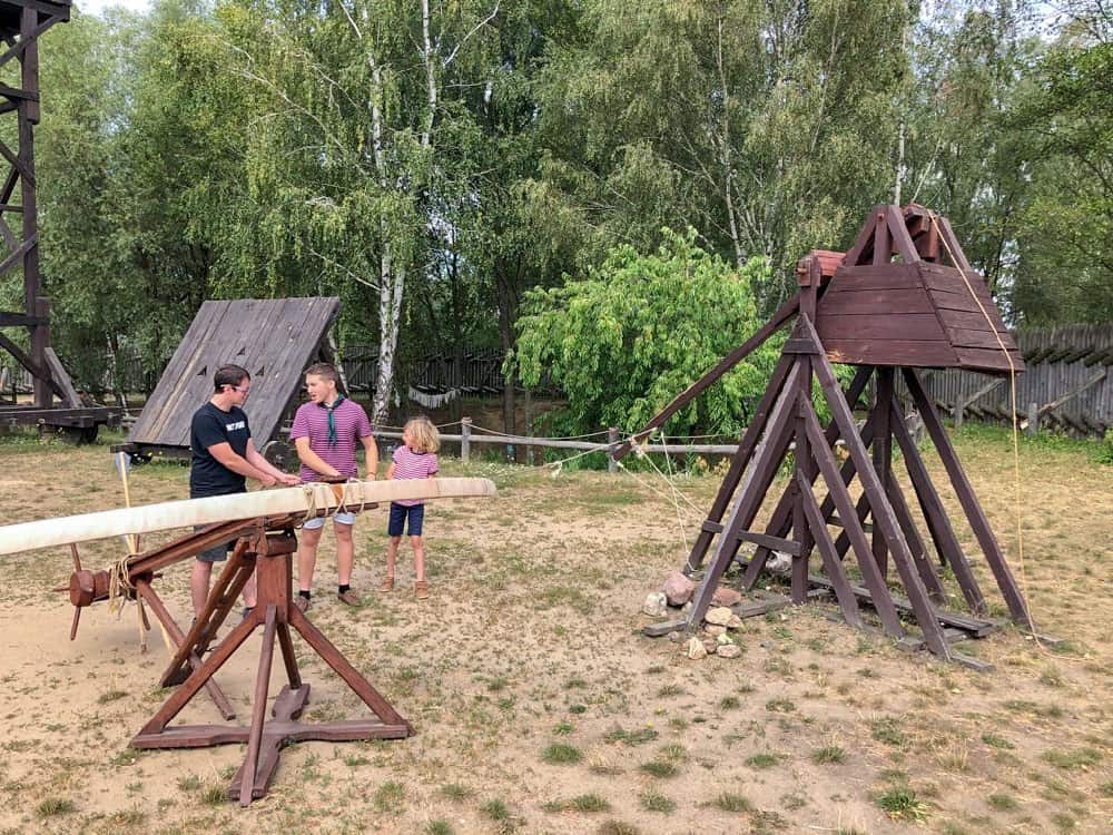 Po sąsiedzku z Parkiem Miniatur rezyduje świetna – i to nie tylko dla dzieci – wystawa Maszyn Oblężniczych w Grodzie w Pobiedziskach. Większość chłopców w wieku od 2 do 102 lat będzie zachwycona (a i dziewczynki w wieku każdym znajdą coś dla siebie). Praktycznie wszystkie prezentowane maszyny działają – można więc strzelić z jedynej w Polsce kuszy wałowej lub ogromnego trebusza. Możemy sprawdzić jak poruszał się taran, przymierzyć strój wojów i przetestować jak działały kiedyś karuzele dla dzieci. Leon na samo wspomnienie wszelkich działań wojennych w Pobiedziskach ma na twarzy uśmiech… :)