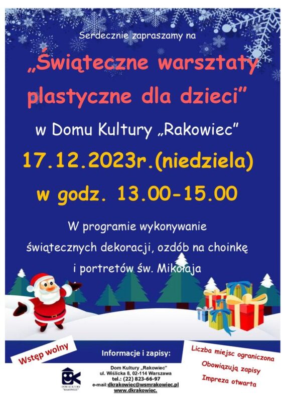 W niedzielę 17 grudnia zapraszamy na warsztaty plastyczne dla dzieci do Domu Kultury Rakowiec ul. Wiślicka 8.